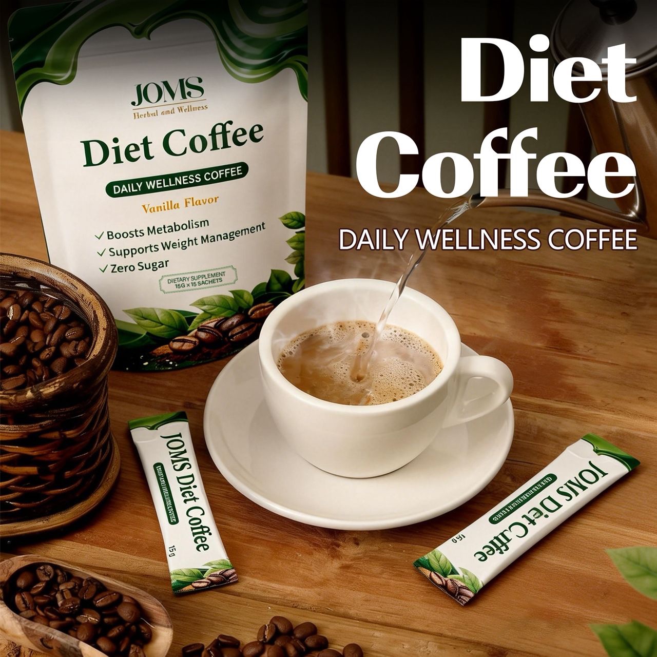 JOMS Daily Wellness Coffee is a thoughtfully formulated functional coffee designed to help support appetite control, metabolism, and daily wellness — without sugar or unnecessary additives.